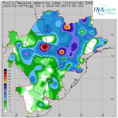 En Goya el nivel registró el 26 de febrero 4,21 metros, con un pico esperado del orden de 5,00 metros en los primeros días de marzo. Promedio semanal: 4,01 metros (1,08 m de ascenso 3 promedio). Promediaría en febrero 3,25 metros (0,99 metros por debajo del promedio desde 1998).