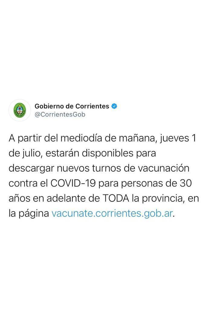 El Gobierno provincial anunció por medio de su Twitter oficial que “a partir del mediodía de mañana, jueves 1 de julio, estarán disponibles para descargar nuevos turnos de vacunación contra el COVID-19 para personas de 30 años en adelante de toda la provincia”.