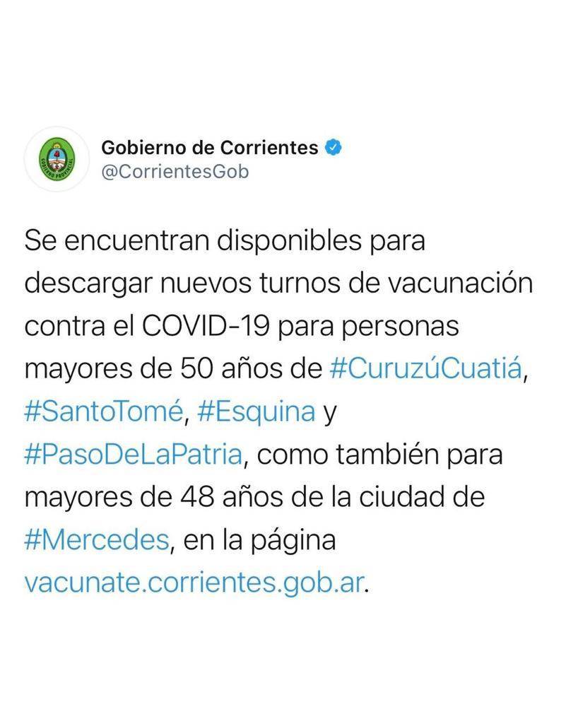 El Gobierno provincial informó por medio de su Twitter oficial, que se encuentran disponibles para descargar los nuevos turnos de vacunación contra el COVID-19 para personas mayores de 50 años de Curuzú Cuatiá, Santo Tomé, Esquina y Paso de la Patria, como también para mayores de 48 años de la ciudad de Mercedes en la página vacunate.corrientes.gob.ar.