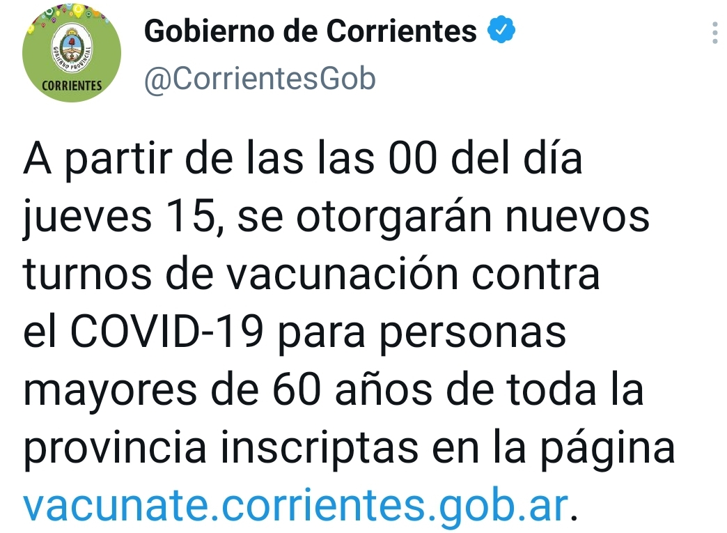 El gobierno provincial informó a través de las redes sociales que a partir de las 00 del día jueves 15, se otorgarán nuevos turnos de vacunación contra el COVID-19 para personas mayores de 60 años de toda la provincia inscriptas en la página vacunate.corrientes.gob.ar.