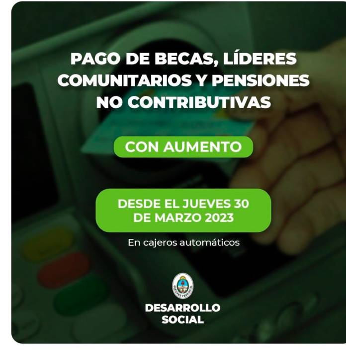El Ministerio de Desarrollo Social de la provincia, informa a beneficiarios, que desde este jueves 30 de marzo    del 2023, estará disponible el pago de  Becas, Pensiones No Contributivas  y Líderes Comunitarios dependientes de este organismo con aumento.
