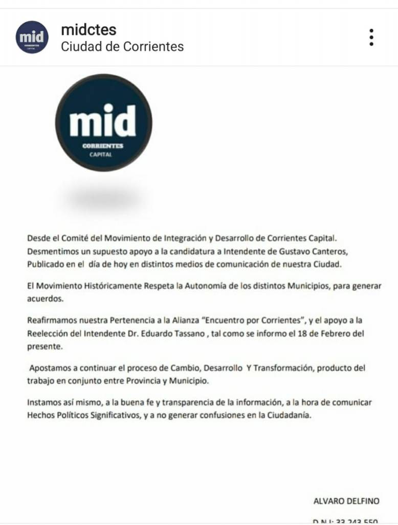 En un comunicado oficial dado a conocer en la jornada de hoy viernes, partidos políticos que fueron mencionados como apoyando la candidatura a intendente de Gustavo Canteros, hoy desmintieron tal situación.