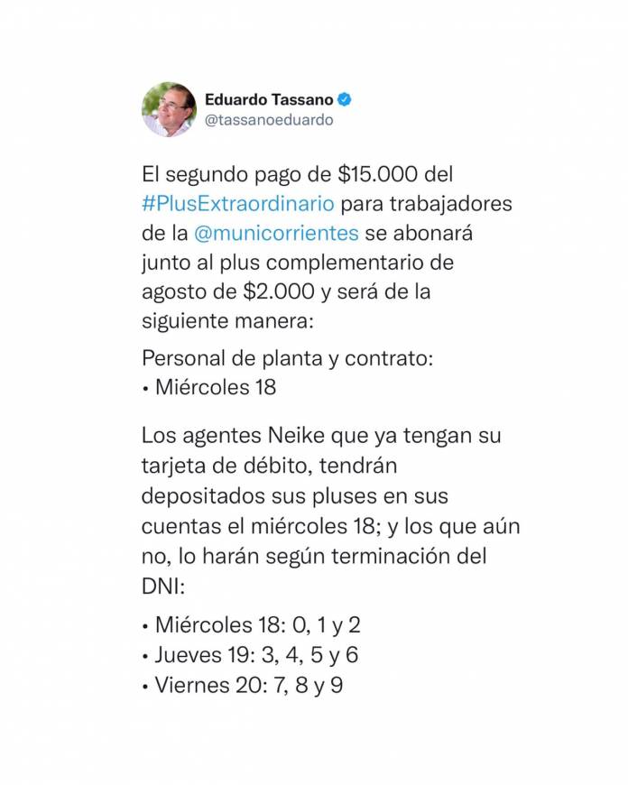 La Municipalidad de Corrientes efectivizará desde este miércoles 18 el pago de los 15.000 pesos correspondientes a la segunda parte del plus extraordinario para todo el personal (trabajadores Neike, contratados y planta permanente), pago que se abonará junto al plus complementario de $ 2.000.