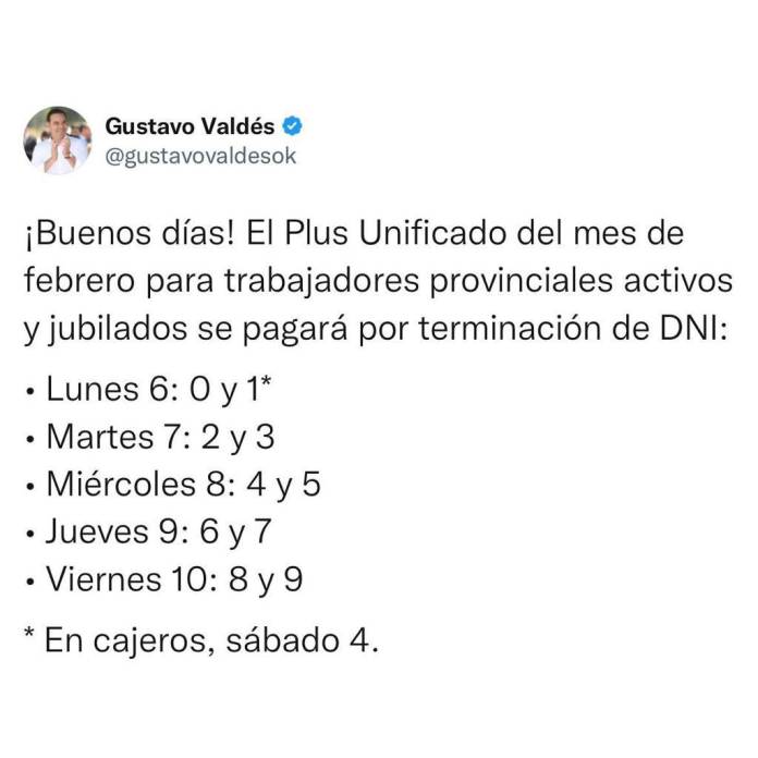 El gobernador Gustavo Valdés anunció el cronograma de liquidación de este beneficio correspondiente a febrero. Se extiende hasta el viernes 10. Perciben los agentes activos, jubilados y pensionados de la administración pública provincial.