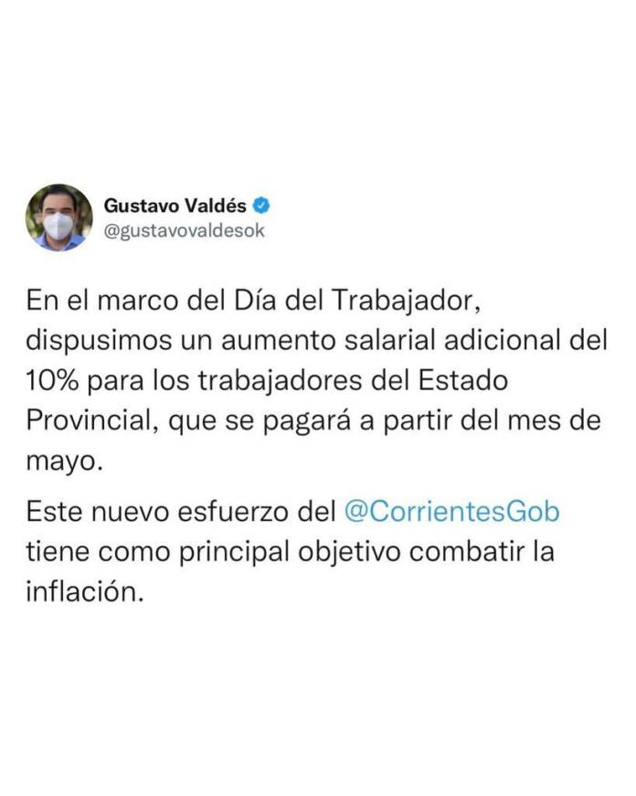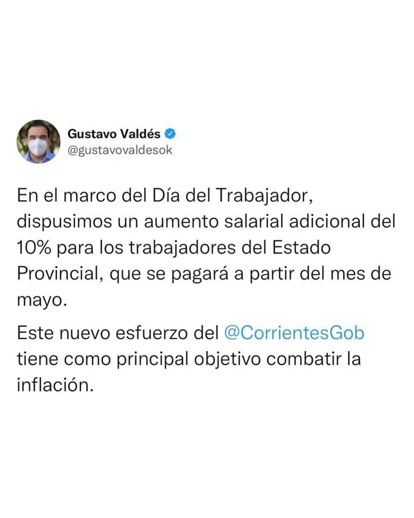 “En el marco del Día del Trabajador, dispusimos un aumento salarial adicional del 10% para los trabajadores del Estado provincial, que se pagará a partir del mes de mayo”, publicó Valdés en sus redes sociales. Y explicó “que este nuevo esfuerzo del Gobierno provincial, tiene como objetivo principal combatir la inflación”.