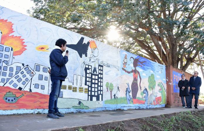 Este miércoles, el intendente Eduardo Tassano encabezó el acto inaugural de un mural de concientización sobre la preservación del medioambiente, un trabajo realizado por estudiantes de sexto año del Colegio Secundario “Fernando Piragine Niveyro” que se llevó a cabo en el marco de la segunda edición del programa Mitá – Jóvenes por el Medio, que impulsa la Municipalidad de Corrientes con el objetivo de desarrollar proyectos artísticos que promuevan el interés, el tratamiento y el abordaje, por parte de jóvenes y docentes, de temáticas referentes a la sustentabilidad.