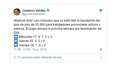 Inicio Actualidad Provincia paga el plus de $5.800 desde el miércoles 17 Provincia paga el plus de $5.800 desde el miércoles 17 julio 11, 2019 764 0 FacebookTwitterPinterestWhatsApp El adicional que hasta el junio fue de $5.500, se pagará este mes con un aumento de $300. Artículos relacionadosMás del autor Juan Pablo Valdés juró como nuevo gobernador instando a “seguir transformando Corrientes” El gobernador Juan Pablo Valdés puso en funciones a los ministros de su gabinete Pullaro dijo que la “expectativa es que Juan Pablo Valdés sea tan buen gobernador como su hermano” DEJA UNA RESPUESTAIniciar sesión para dejar un comentario