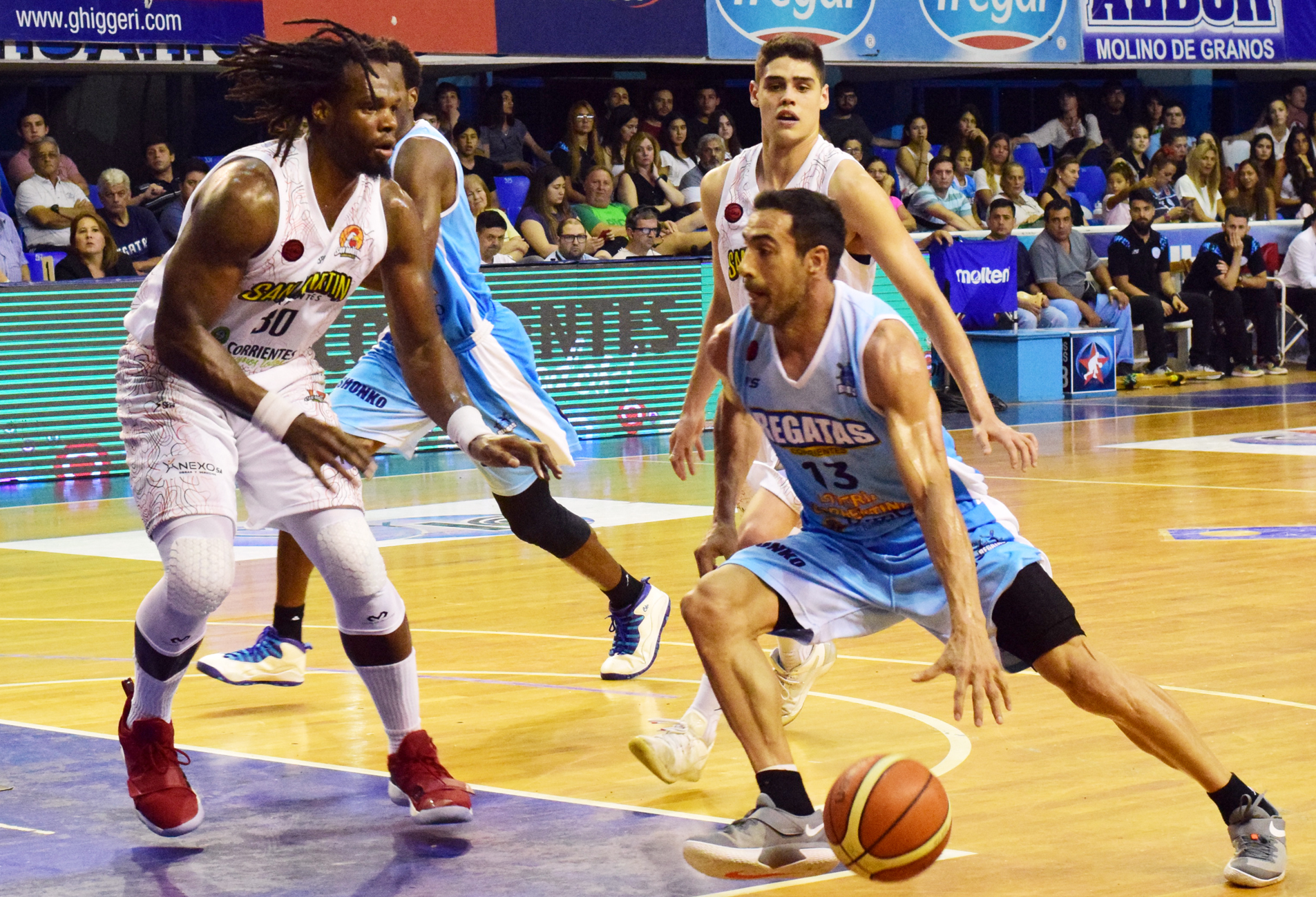 Haciendo gala de una tremenda ofensiva, comandada por Marco Giordano, Regatas Corrientes superó a San Martín por 102 a 83 y se adelantó en la serie Repechaje del Súper 20, que continuará este sábado en el “Fortín Rojinegro”. Nuevamente la figura del  clásico fue juvenil campeón olímpico, con 22 puntos (5/6 en simples, 1/1 en dobles, y 5/7 en triples), que apareció en los momentos calientes del match.