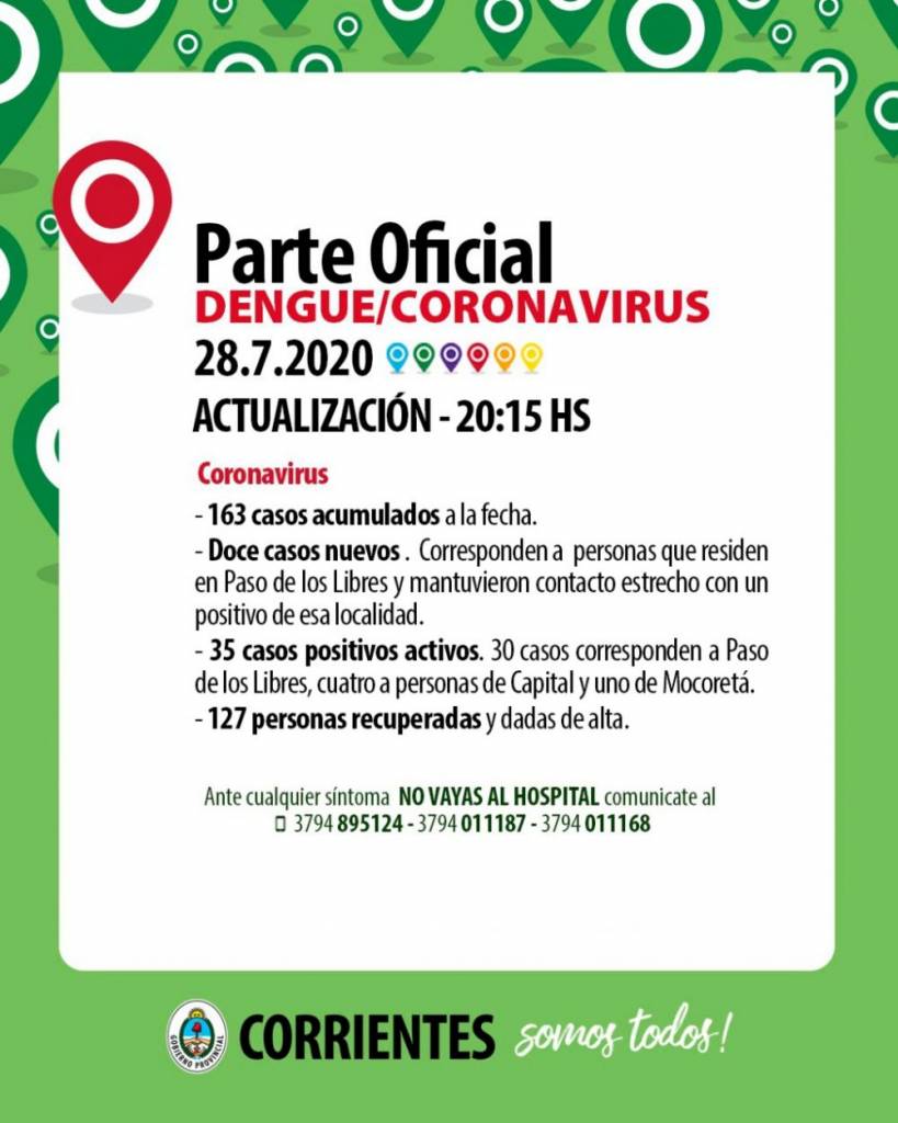 El parte oficial de este martes a la tarde anuncia 12 nuevos casos en Paso de los Libres y la localidad suma un total de 30 casos activos.