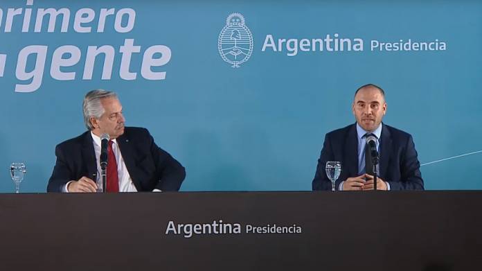Alberto Fernández y Martín Guzmán, en la presentación del proyecto (Captura de TV).