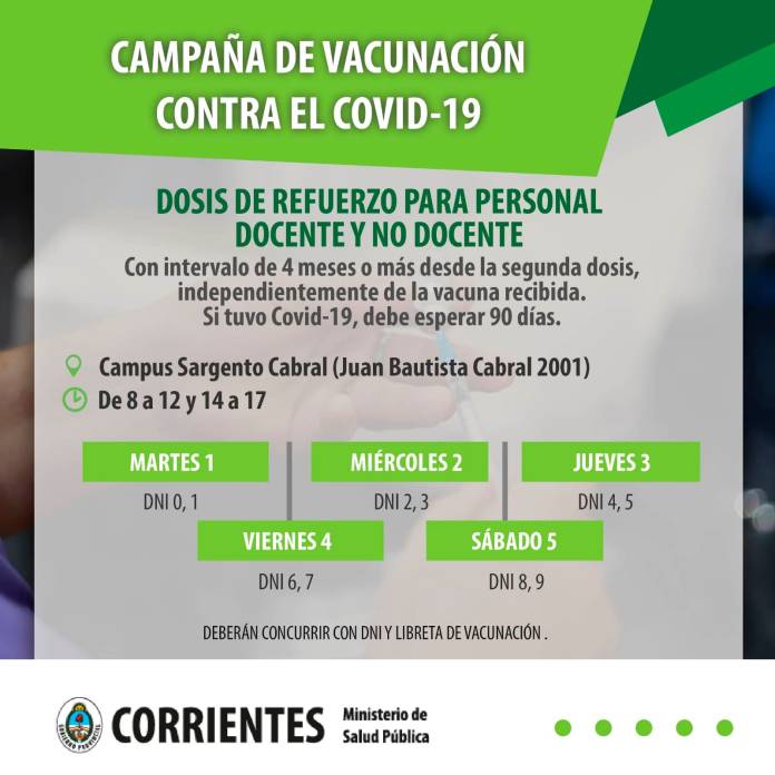 El Ministerio de Salud Pública a través de la Dirección de Inmunizaciones, habilita desde este martes un punto de vacunación para personal docente y no docente, en el marco de la campaña contra el Covid-19. Se aplicarán el refuerzo con intervalo de 4 meses o más desde la segunda dosis, independientemente de la vacuna recibida, y con la recomendación de que si tuvo Covid-19, debe esperar 90 días.