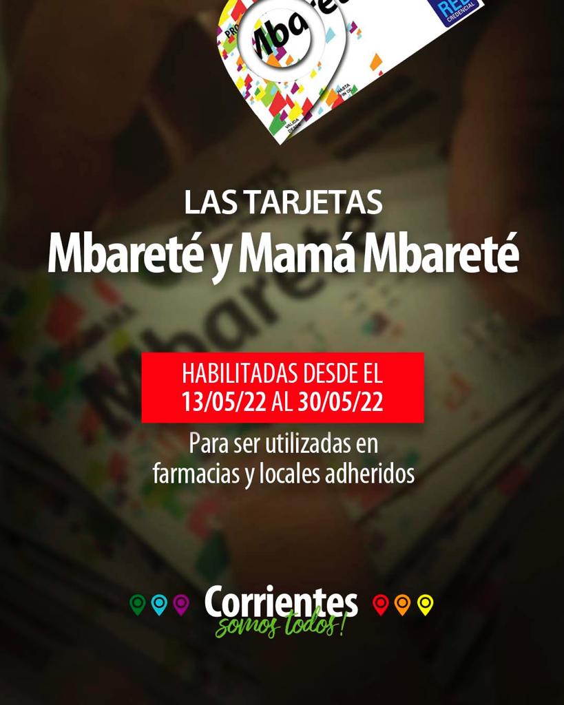 El Gobierno provincial, a través del Ministerio de Salud Pública comunica que las tarjetas Mbareté y Mamá Mbareté se encuentran habilitadas desde el día de la fecha 13 de mayo hasta el 30 de mayo del 2022 inclusive, para ser utilizadas por los beneficiarios de las mismas.