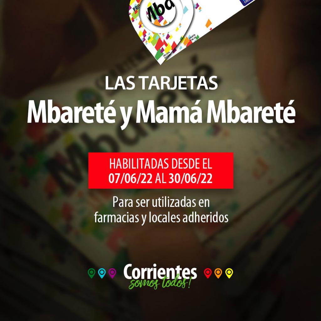 El Gobierno provincial, a través del Ministerio de Salud Pública comunica que las tarjetas Mbareté y Mamá Mbareté se encuentran habilitadas desde el día de la fecha 07 de junio hasta el 30 de junio del 2022 inclusive, para ser utilizadas por los beneficiarios de las mismas.