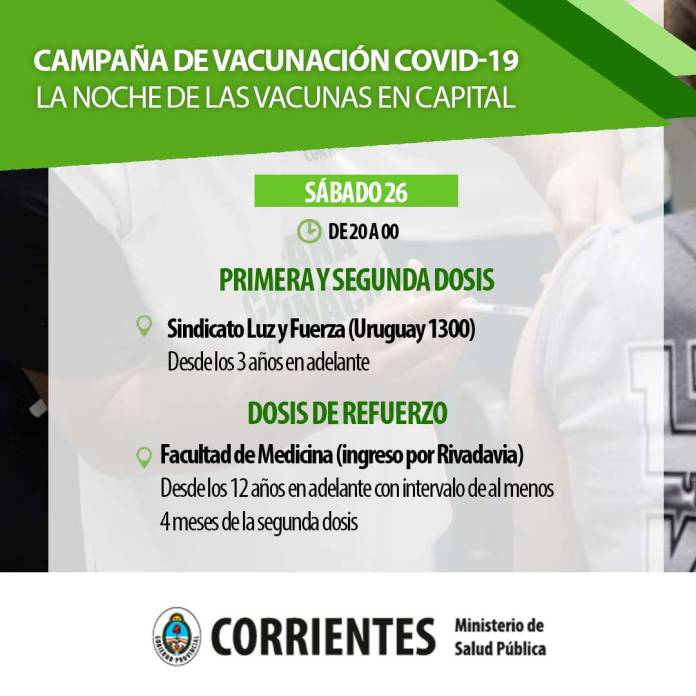 En el marco de la Campaña de Vacunación Covid-19, el Ministerio de Salud Pública, a través de la Dirección de Inmunizaciones, realizará nuevamente este sábado la estrategia denominada “La Noche de las Vacunas”, mediante la cual se brinda a todas las familias correntinas la posibilidad de iniciar, completar esquema y recibir el refuerzo.