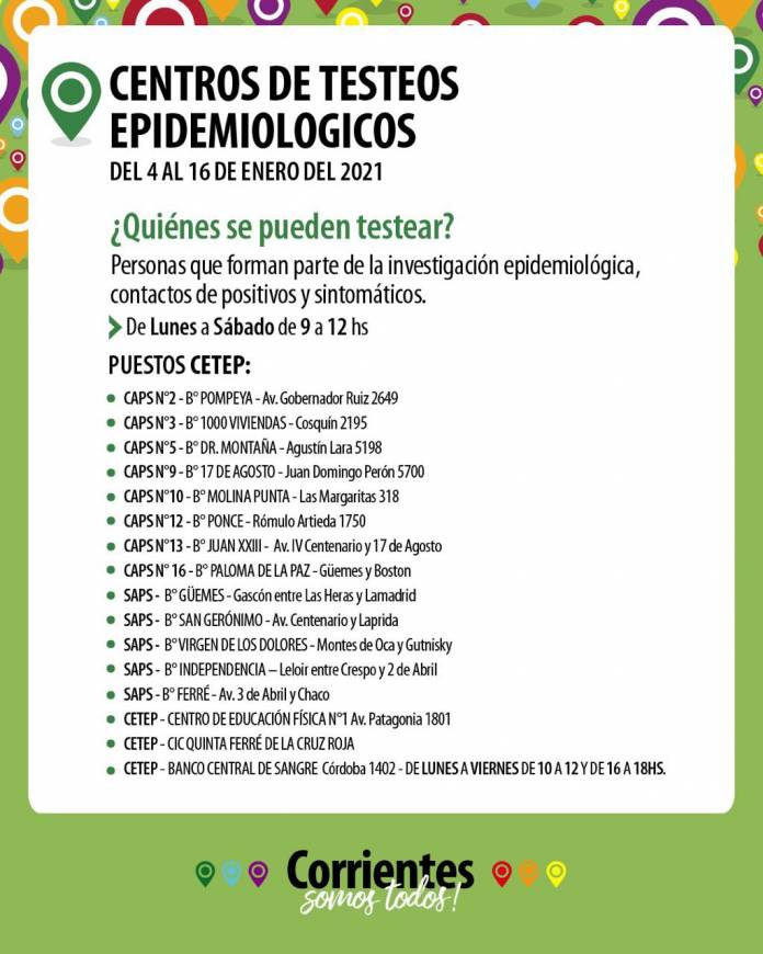 La directora general de Epidemiología de la Provincia, Angelina Bobadilla, detalló que “vamos a implementar durante todo enero la estrategia de atención de demanda espontánea. Es decir, las personas que presenten síntomas o sean contacto estrecho de positivos podrán concurrir para hacerse el test al CETEP más cercano a su domicilio”.