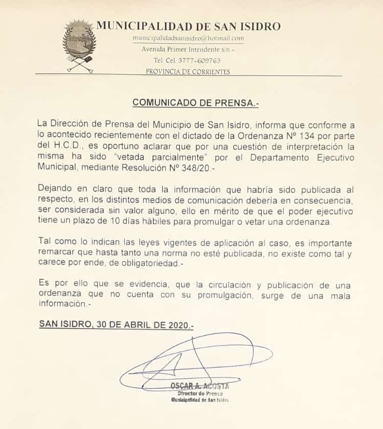Con la libertad de prensa “por el piso”, el documento del Concejo de San Isidro menciona además que “la divulgación de una noticia distinta, o interpretativa a la que el Municipio da conocer será considerada como falta grave y de sanción”.