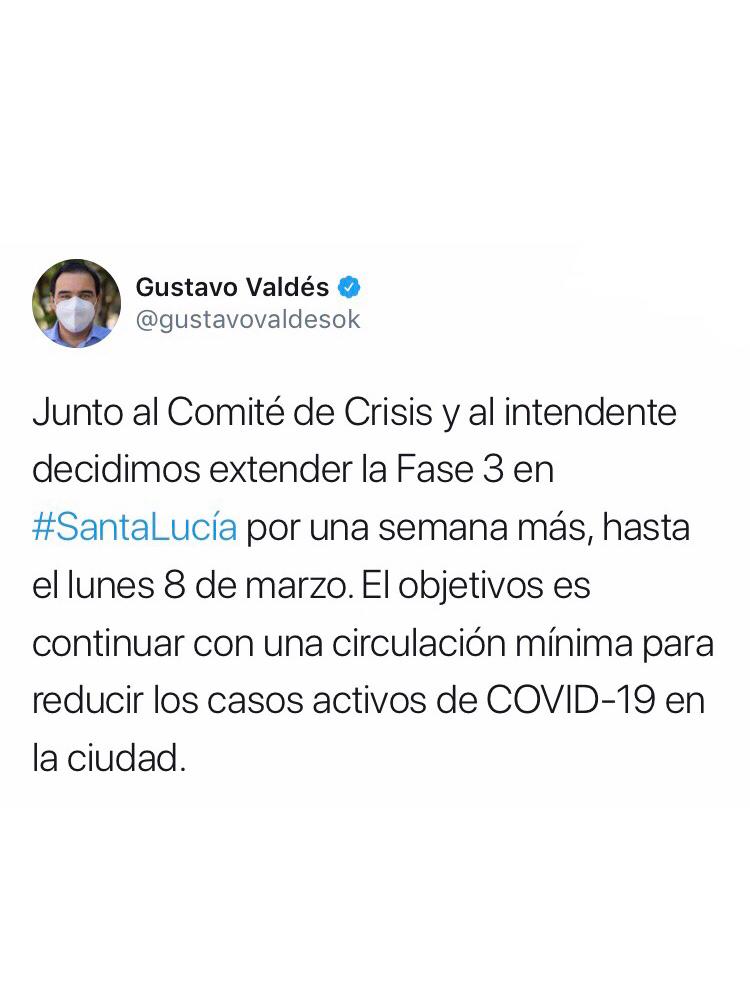 El gobernador Gustavo Valdés informó que junto al Comité de Crisis y al intendente de Santa Lucía, José Sananez, decidieron extender la Fase 3 en en la localidad por una semana más, hasta el lunes 8 de marzo. “El objetivos es continuar con una circulación mínima para reducir los casos activos de COVID-19 en la ciudad”, explicó este domingo el Mandatario provincial en Twitter.