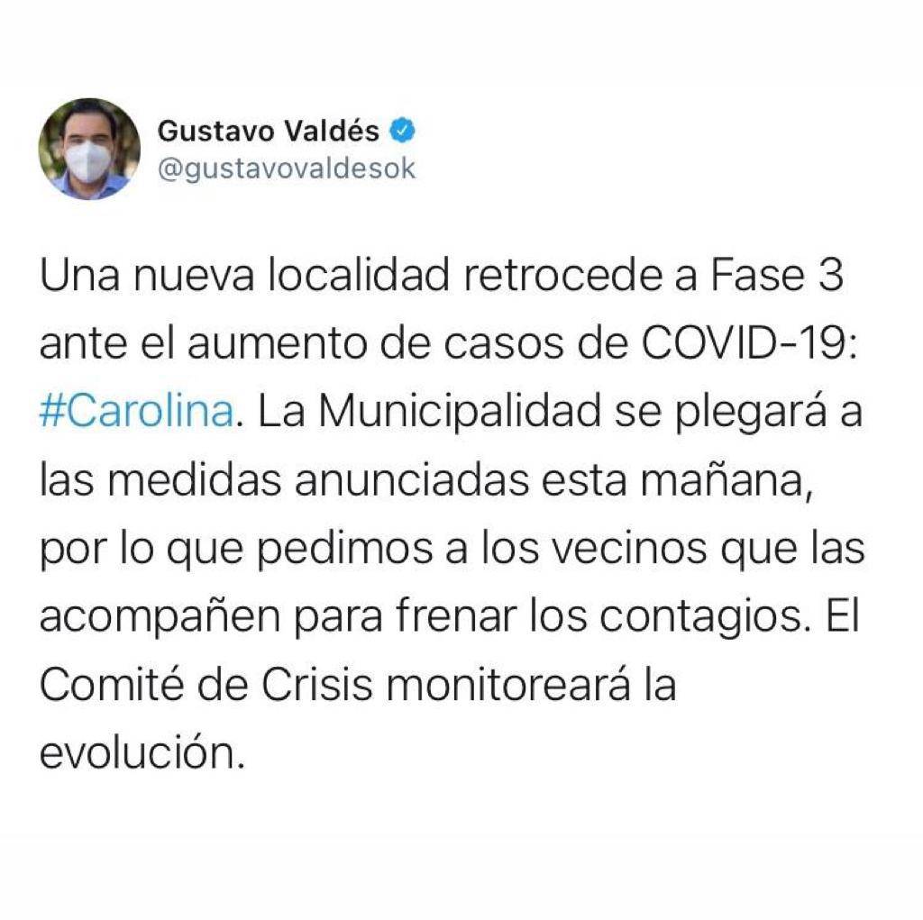Del mismo modo, el gobernador Gustavo Valdés informó que la localidad de Carolina retrocede a Fase 3 ante el aumento de casos de COVID-19. Indicó además que la Municipalidad se plegará a las medidas anunciadas esta mañana, y pidió desde su cuenta de Twitter a los vecinos que las acompañen para frenar los contagios. El Comité de Crisis monitoreará la evolución.