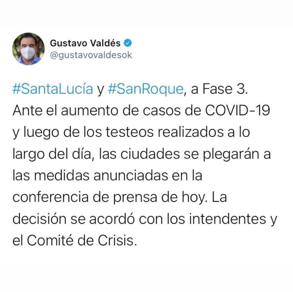El gobernador Gustavo Valdés informó que Santa Lucía y San Roque pasan a Fase 3. “Ante el aumento de casos de COVID-19 y luego de los testeos realizados a lo largo del día, las ciudades se plegarán a las medidas anunciadas en la conferencia de prensa de hoy”, indicó desde Twitter el Mandatario y agregó que “la decisión se acordó con los intendentes y el Comité de Crisis”.