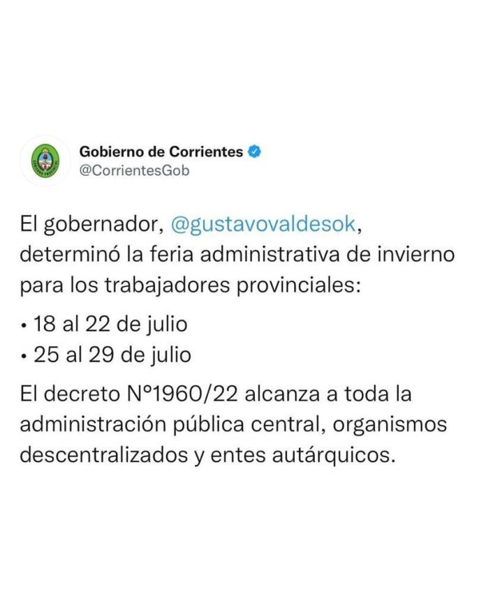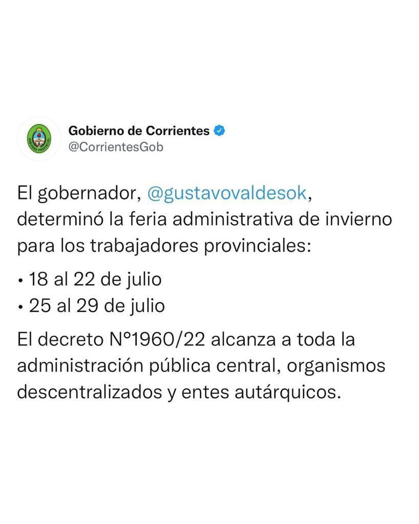 El gobernador Gustavo Valdés rubricó el decreto N°1960/22, el cual establece la feria administrativa de invierno para los trabajadores provinciales, del 18 a 22 de julio y del 25 a 29 del mismo mes.