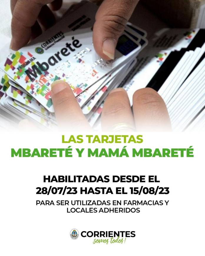El Gobierno provincial, a través del Ministerio de Salud Pública, a cargo de Ricardo Cardozo, comunica que las tarjetas Mbareté y Mamá Mbareté se encuentran habilitadas desde el día de la fecha 28 de julio hasta el 15 de agosto de 2023 inclusive, para ser utilizadas por los beneficiarios de las mismas.