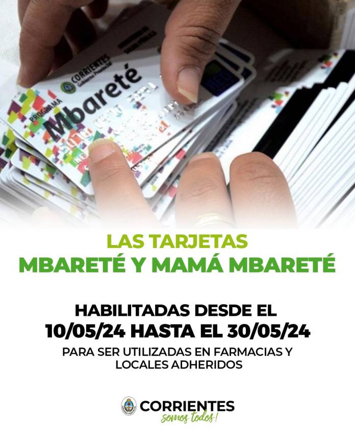 Se encuentran habilitadas las tarjetas Mbareté y Mamá Mbareté para ser utilizadas por sus beneficiarios desde el día de la fecha hasta el 30 de mayo.