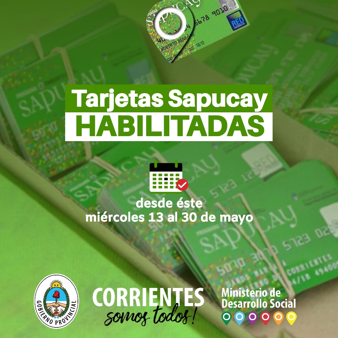 El Ministerio de Desarrollo Social de Corrientes, a cargo de Adán Gaya, informó que las Tarjetas  Sapucay están habilitadas desde hoy 13 y hasta el 30 de mayo próximo.