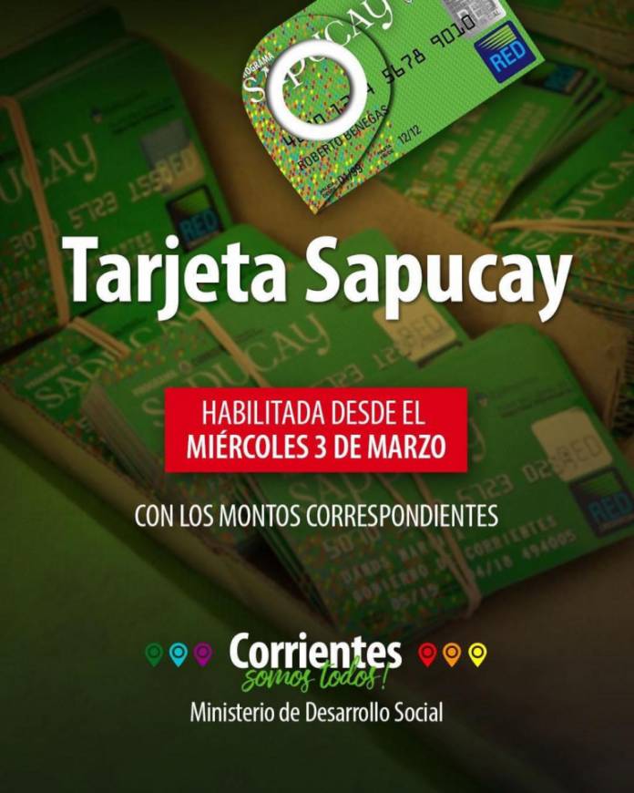 El Ministerio de Desarrollo Social del Gobierno de Corrientes, a cargo de Adán Gaya informa a los beneficiarios del Programa que las Tarjetas Sapucay estarán a disposición desde este miércoles 3 de marzo.