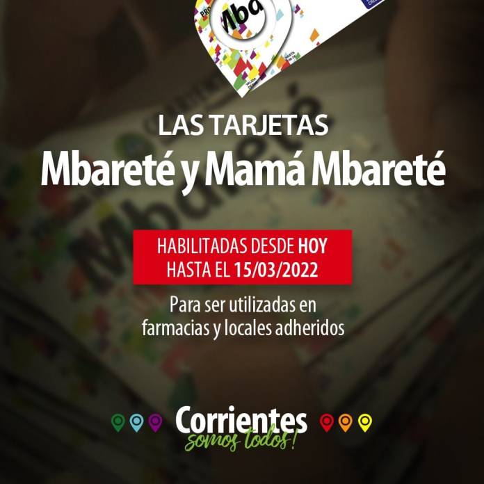 El Gobierno de Corrientes informó que se encuentran habilitadas desde este miércoles 23 de febrero, las tarjetas Mbareté y Mamá Mbareté para ser utilizadas por sus beneficiarios.