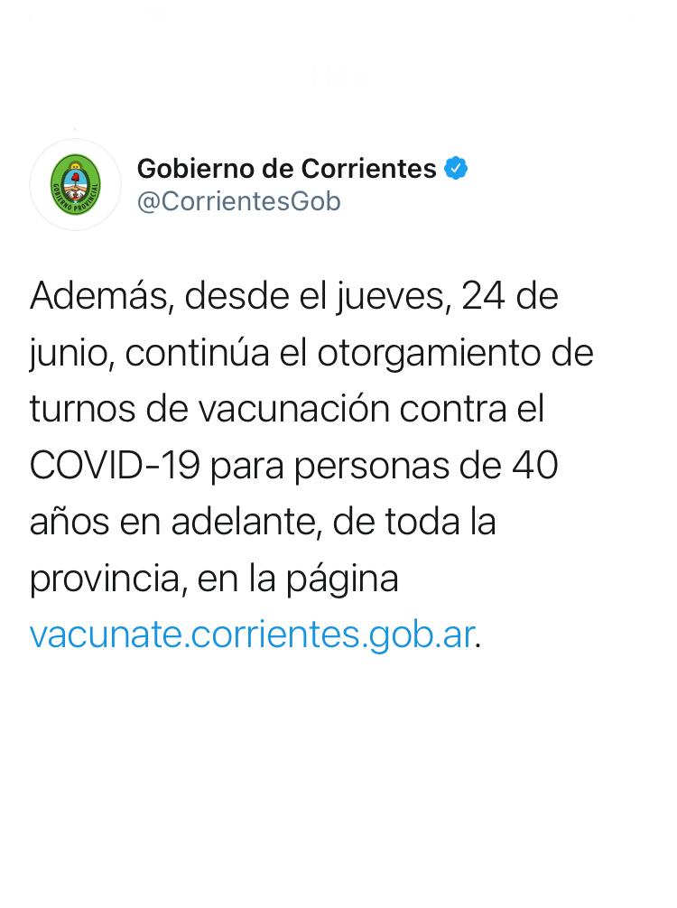 Por otro lado, se comunica que “desde el jueves 24 de junio continúa el otorgamiento de turnos de vacunación contra el COVID-19 para personas de 40 años en adelante, de toda la provincia”.