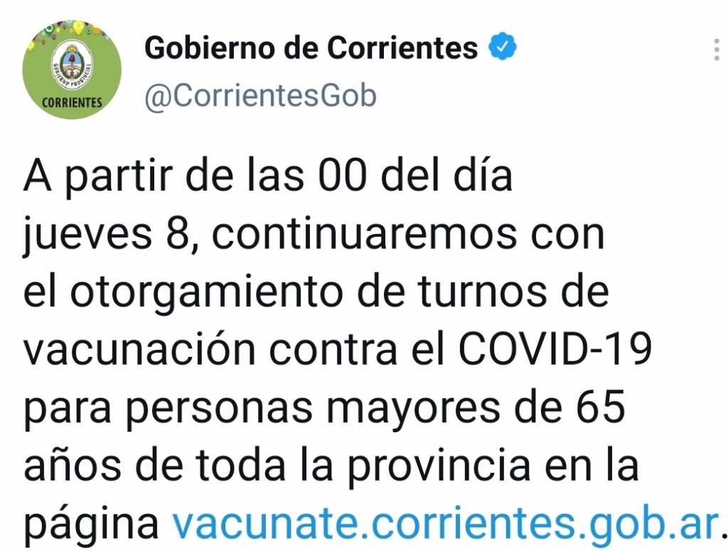 El Gobierno de Corrientes informó por medio de su cuenta oficial de Twitter (@CorrientesGob) que a partir de las 00 de este jueves 8, estarán disponibles para descargar los nuevos turnos de vacunación contra el COVID-19 para mayores de 65 años de toda la provincia.