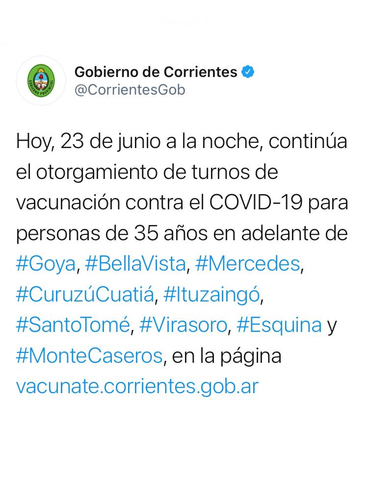 El Gobierno provincial anunció por medio de su Twitter oficial que a partir de esta noche “continúa el otorgamiento de turnos de vacunación contra el COVID-19 para personas de 35 años en adelante” de las siguientes localidades: Goya, Bella Vista, Mercedes, Curuzú Cuatiá, Ituzaingó, Santo Tomé, Virasoro, Esquina y Monte Caseros.