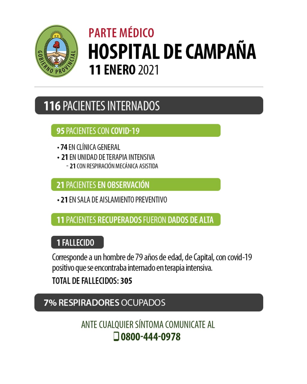 El Ministerio de Salud Pública informó este lunes el parte médico del Hospital de Campaña Escuela Hogar, dando cuenta de la recuperación de 11 pacientes que recibieron el alta, mientras que falleció 1 persona con resultado positivo para Covid-19.