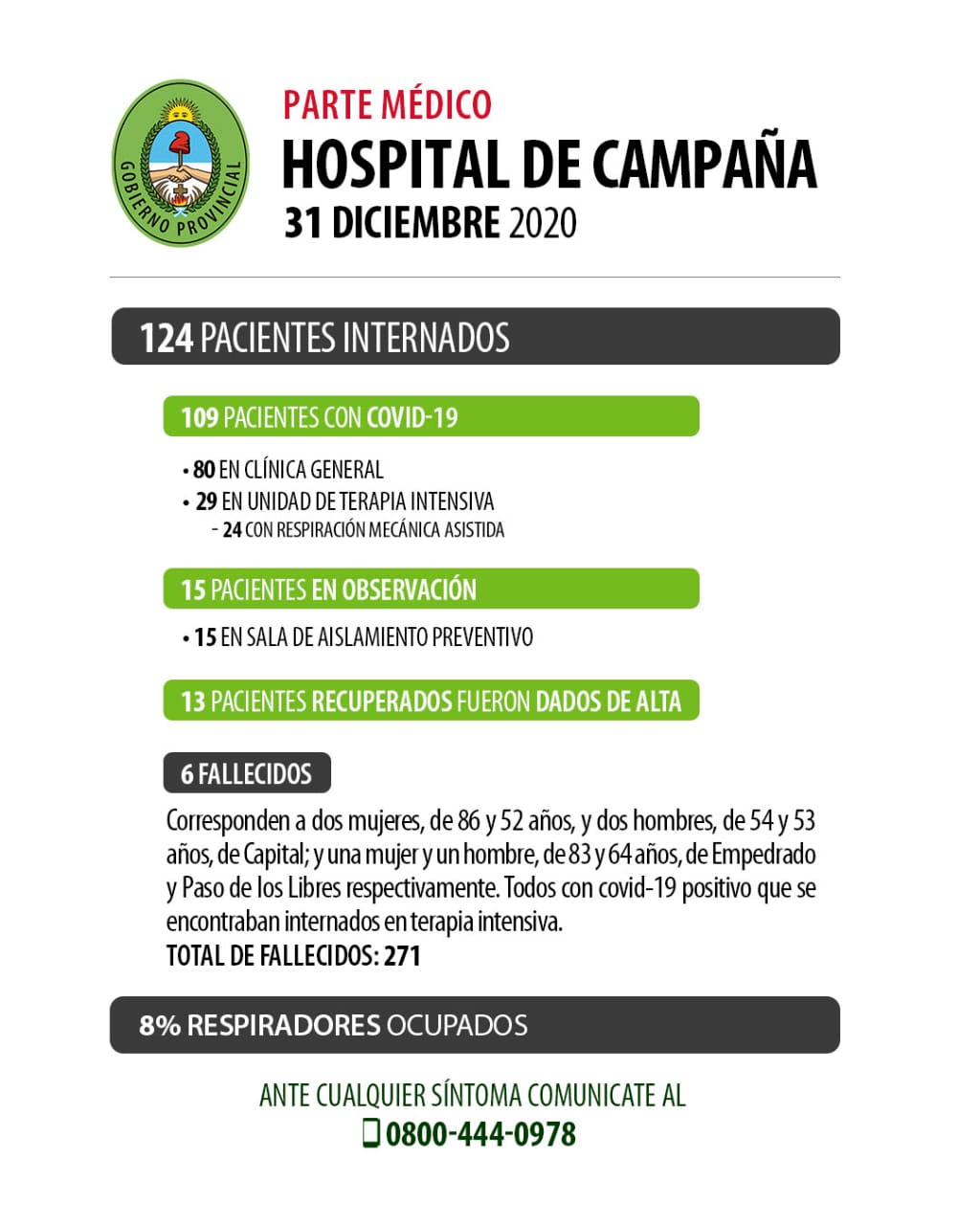 El Ministerio de Salud Pública informó este jueves el parte médico del Hospital de Campaña Escuela Hogar, dando cuenta de la recuperación de 13 pacientes que recibieron el alta, mientras que fallecieron 6 personas con resultado positivo para Covid-19.