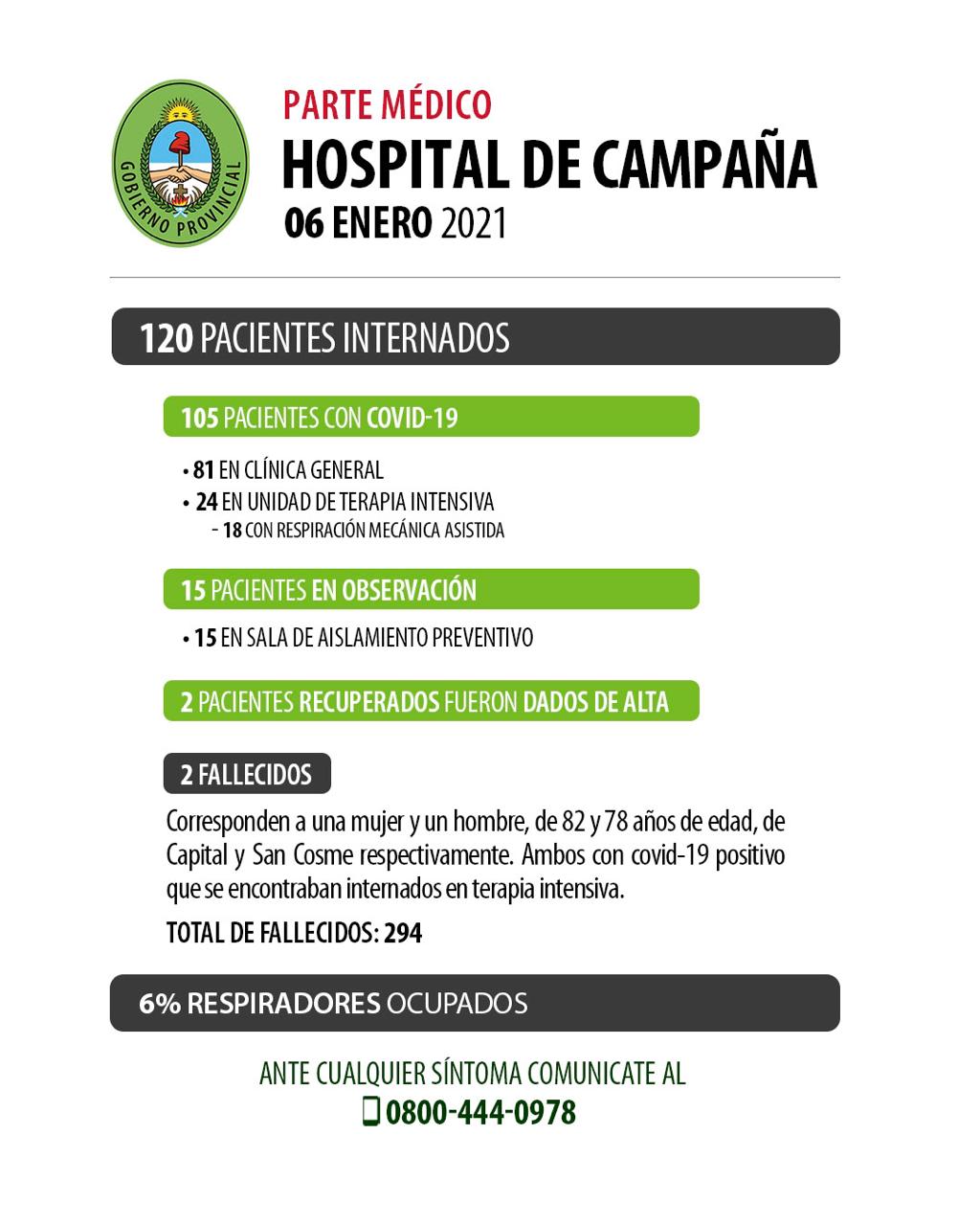 El Ministerio de Salud Pública informó este miércoles el parte médico del Hospital de Campaña Escuela Hogar, dando cuenta de la recuperación de 2 pacientes que recibieron el alta, mientras que fallecieron 2 personas con resultado positivo para Covid-19.
