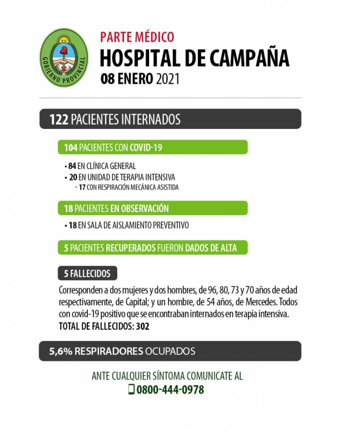 En cuanto a los fallecimientos de la fecha, se trata de un hombre de 73 años de Capital con antecedente de hipertensión, Accidente Cerebro Vascular, y neumonía por Covid-19. Un hombre de 70 años de Capital con antecedente de hipertensión, Accidente Cerebro Vascular, y neumonía por Covid-19. Un hombre de 54 años de Mercedes con antecedente de diabetes y neumonía por Covid-19. Una mujer 80 años de capital con antecedente de hipertensión, cardiopatía isquémica y neumonía por Covid-19. Y una mujer de 96 años de Capital con antecedente de diabetes, hipertensión y neumonía por Covid-19.