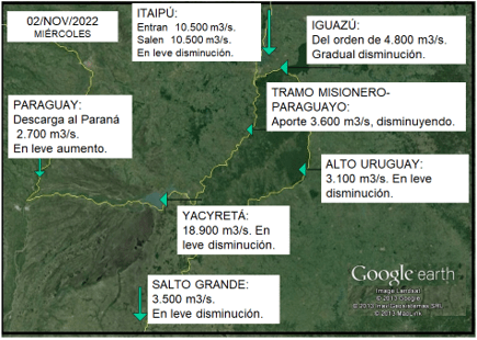 En los últimos días en Yacyretá se registró un leve incremento sobre un caudal medio próximo a 18.000 metros cúbicos por segundo, muy por encima de los valores normales para la época. Actualmente la descarga se encuentra en leve disminución. El embalse presenta niveles operativos normales, por lo tanto, el derrame hacia el tramo argentino del río Paraná se encuentra sujeto al caudal de entrada al embalse y al patrón de precipitaciones sobre el área inmediata al mismo, con lo cual, la disminución de lluvias sobre todo el tramo tendrá por efecto una acotada disminución para la próxima semana.