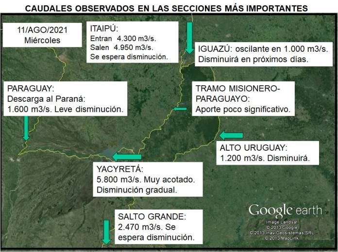 El río Paraná en el tramo paraguayo–argentino presenta caudal muy inferior al normal; sobre la cuenca de aporte al tramo paraguayo-argentino del río Paraná no se registraron precipitaciones significativas.