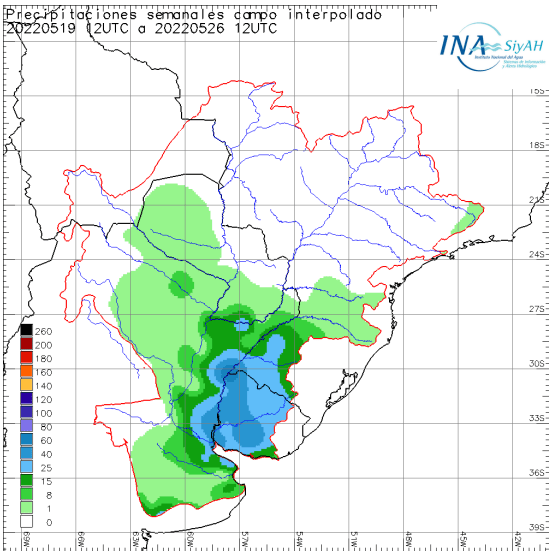 Durante los últimos 7 días se registraron lluvias leves sobre el área de aporte al tramo Corrientes-Yacyretá, con valores promedio de precipitación acumulada levemente superiores a los 22 milímetros.