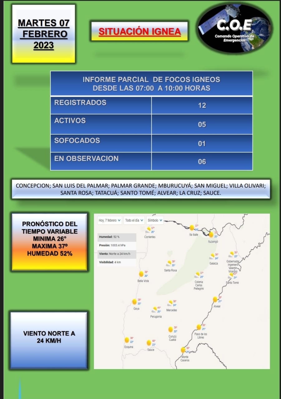 El Comando Operativo de Emergencias (COE) de la provincia de Corrientes informó este martes 7 de febrero de 2023, que en las últimas horas se registraron 12 focos de incendios en: Concepción, San Luis del Palmar, Palmar Grande, Mburucuyá, San Miguel, Villa Olivari, Santa Rosa, Tatacuá, Santo Tomé, Alvear, La Cruz y Sauce.