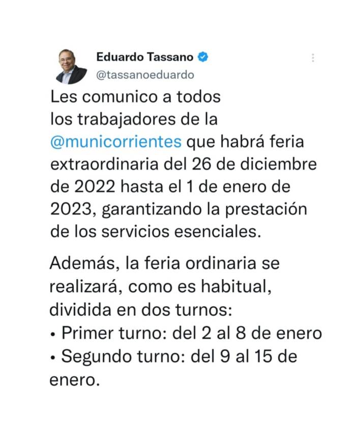 El intendente Eduardo Tassano declaró una feria administrativa extraordinaria para todo el personal municipal, desde el lunes 26 de diciembre de 2022 y hasta el domingo 1 de enero de 2023; y una feria administrativa ordinaria, desde el lunes 2 de enero y hasta el domingo 15 de enero inclusive; con el objeto de “promover el esparcimiento y la integración familiar y social”, según se establece en la resolución Nº 4836.