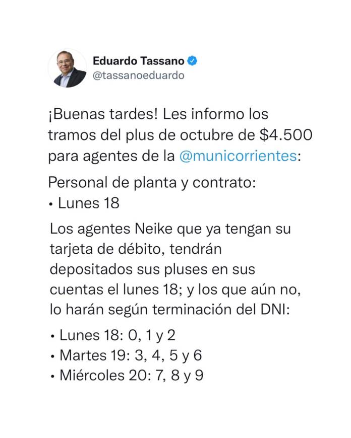 Los agentes de planta, contrato y los trabajadores Neike que ya cuenten con sus tarjetas de débito del Banco de Corrientes cobrarán el lunes, mientras que los Neike que aún no tengan sus plásticos, lo harán según el número de terminación del DNI, desde este lunes y hasta el miércoles 20, en la Caja Municipal de Préstamos. La Municipalidad de Corrientes efectivizará desde este lunes 18 el pago del plus de 4.500 pesos para todo el personal (trabajadores Neike, contratados y planta permanente). El anuncio fue dado a conocer por el intendente Eduardo Tassano a través de sus redes sociales.