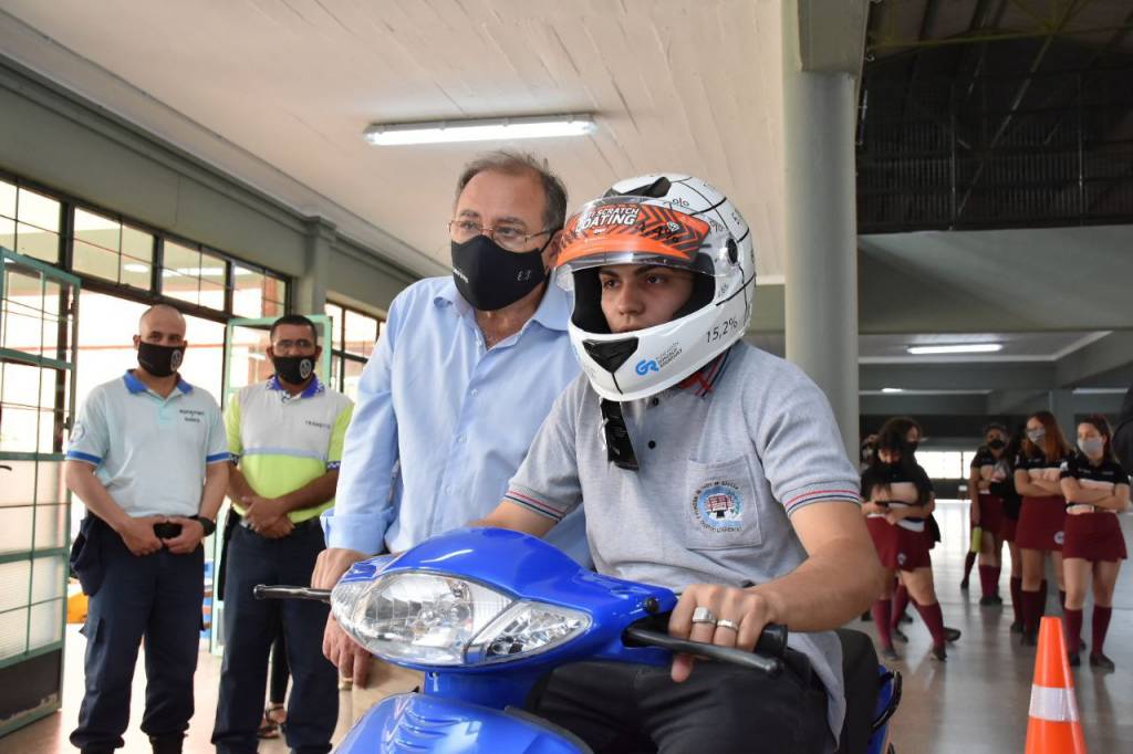 En la tarde de este lunes, el intendente Eduardo Tassano compartió con alumnos del colegio secundario Dr. Eloy M. Ortega, en el barrio 17 de Agosto, donde se implementó nuevamente el programa Mi Primera Licencia, con la particularidad de que incorporó el simulador de conducción de motos, moderno aparato que se encuentra en el Centro Emisor de Licencias (CEL), a través del cual los chicos no sólo pueden aprender a conducir, sino ahora, realizar el examen práctico para la obtención de sus respectivas licencias habilitantes.