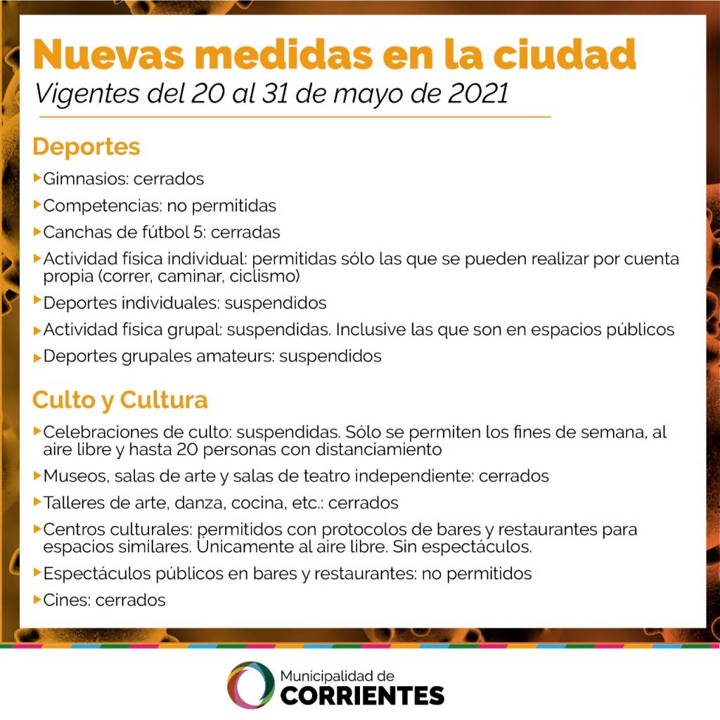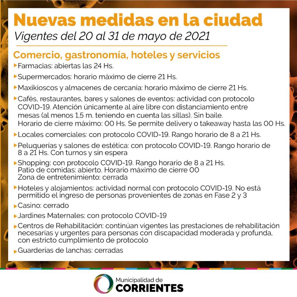 Los bares y restaurantes podrán abrir hasta la medianoche, al aire libre y con el debido distanciamiento. Se prohíben las reuniones sociales y familiares, como así también los gimnasios y los deportes en general, excepto las caminatas individuales y el ciclismo. “Es momento de extremar los cuidados. Trabajamos junto al Gobierno provincial para proteger la salud de la gente y les pedimos a todos los vecinos que actuemos de forma consciente y responsable”, dijo el intendente. “Vamos a fortalecer los controles para garantizar el cumplimiento de las normas. Es muy importante que avancemos todos juntos en ese sentido”, insistió al respecto. Tras los anuncios dados este miércoles por el gobernador Gustavo Valdés respecto de los cuidados preventivos ante la pandemia en el orden provincial, el intendente capitalino Eduardo Tassano especificó el alcance de las nuevas medidas en la ciudad de Corrientes. En ese contexto, instó a los vecinos a continuar desenvolviéndose responsablemente en torno a la pandemia del covid-19, tanto en materia de distanciamiento social como de cumplimiento de las normas vigentes: “Vamos a fortalecer los controles de distanciamiento, las medidas y los cumplimientos de los protocolos y normas vigentes. Es muy importante que colaboremos entre todos para avanzar en ese sentido”, manifestó.