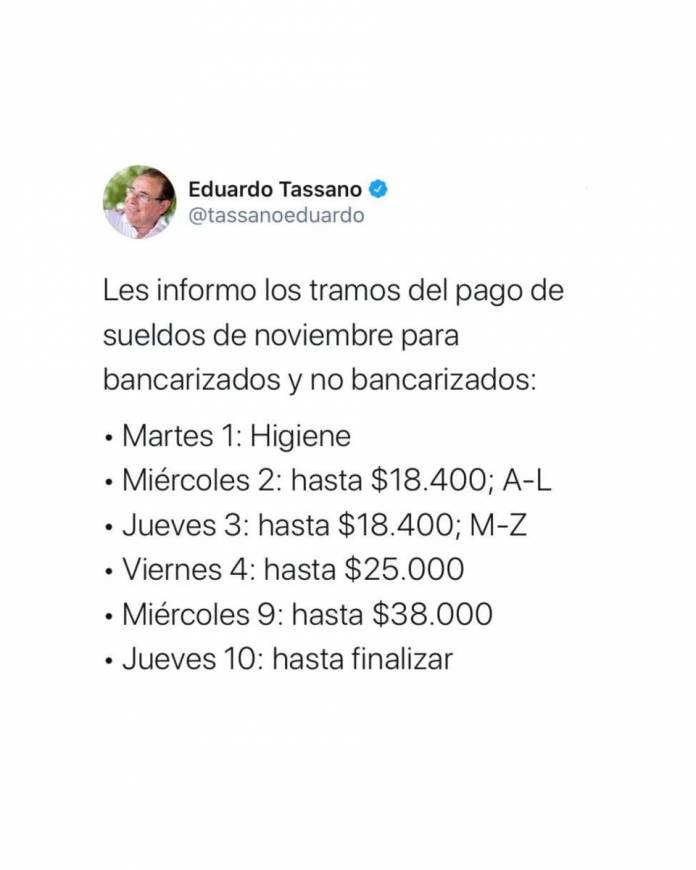 Este martes 1 de diciembre, la Municipalidad de Corrientes arrancará el cronograma de pago de sueldos correspondientes al mes de noviembre para todo el personal, según informó el intendente Eduardo Tassano a través de su cuenta oficial de Twitter.