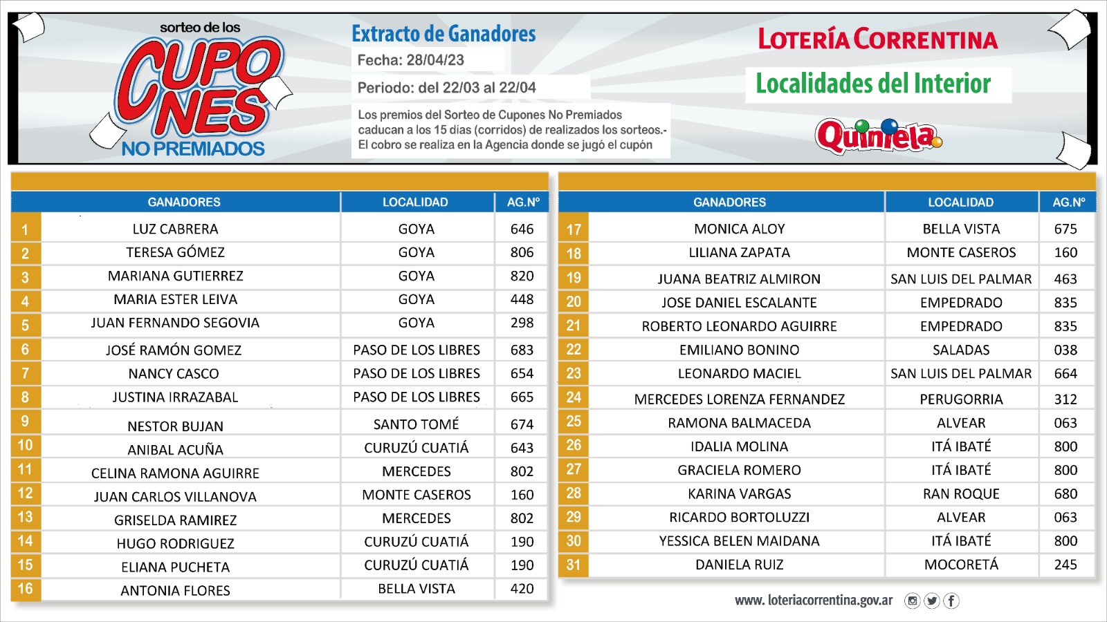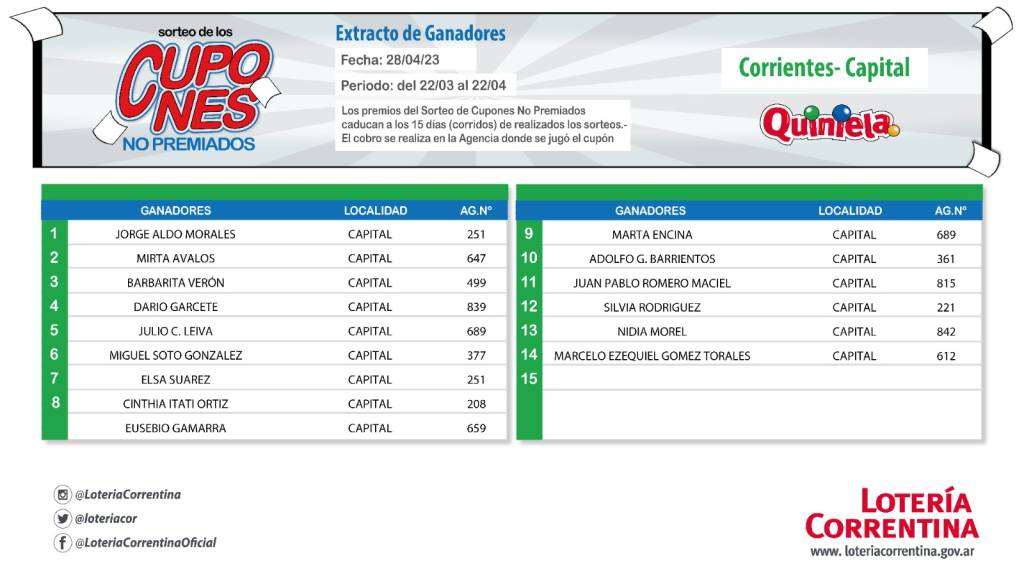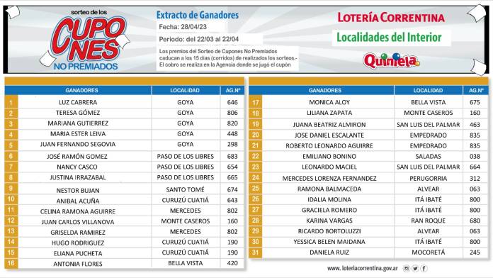 Inicio Actualidad Tercer sorteo de cupones no premiados del año: aquí los ganadores de... Tercer sorteo de cupones no premiados del año: aquí los ganadores de Capital y del interior abril 28, 2023 402 0 FacebookTwitterPinterestWhatsApp Artículos relacionadosMás del autor Valdés habilita la comercialización en farmacias del aceite medicinal de Caá Cannabis Reunión del Co.Pro.Dis con referentes del Nea para fortalecer políticas de discapacidad Corrientes, en reunión de acuerdo de agenda entre Regiones Litoral y Centro DEJA UNA RESPUESTAIniciar sesión para dejar un comentario