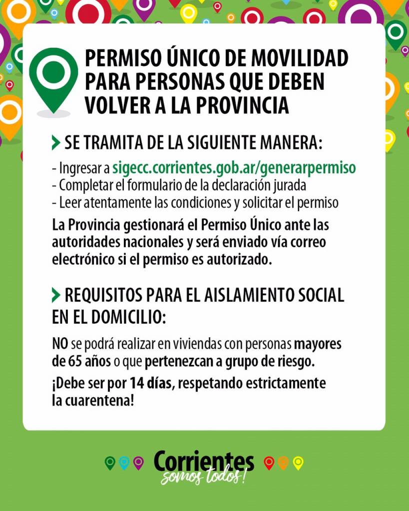 La Provincia informa que aquellos habitantes que deban regresar a la provincia, deben gestionar su autorización ingresando inicialmente al sitio www.sigecc.corrientes.gob.ar/generarpermiso. Luego, deberán completar un formulario de declaración jurada, leer las condiciones y solicitar la misma.