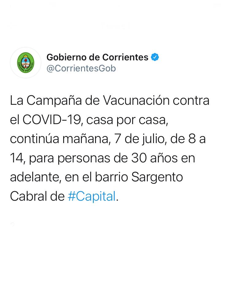 Con la visita casa por casa del personal del Ministerio de Salud, el Gobierno de Corrientes continuará este miércoles 7 de julio, de 8 a14 horas, la campaña de vacunación contra el COVID-19 para personas de 30 años en adelante, en el barrio Sargento Cabral de Capital.