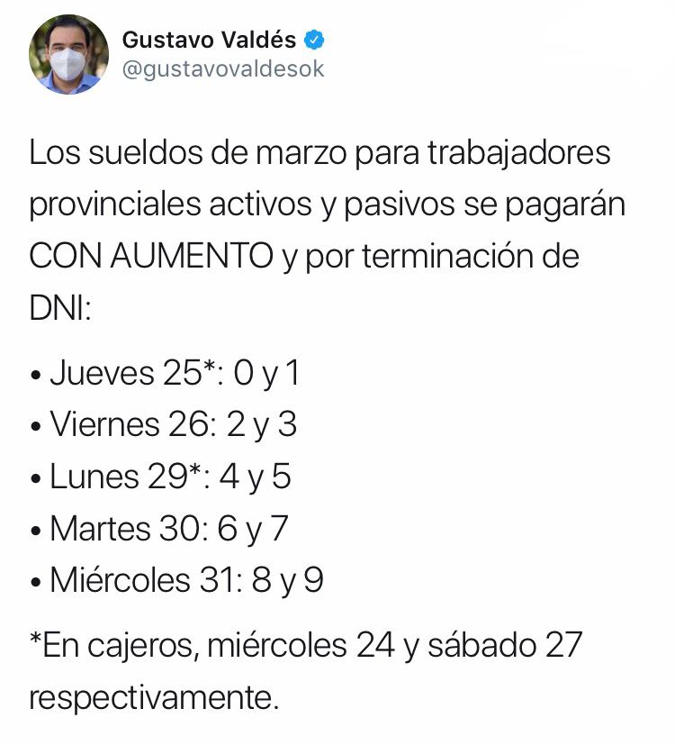 El gobernador Gustavo Valdés anunció este sábado, a través de su cuenta de Twitter, el cronograma salarial para los trabajadores provinciales activos y pasivos. Los haberes incluirán los aumentos anunciados recientemente y se pagarán por terminación de DNI.
