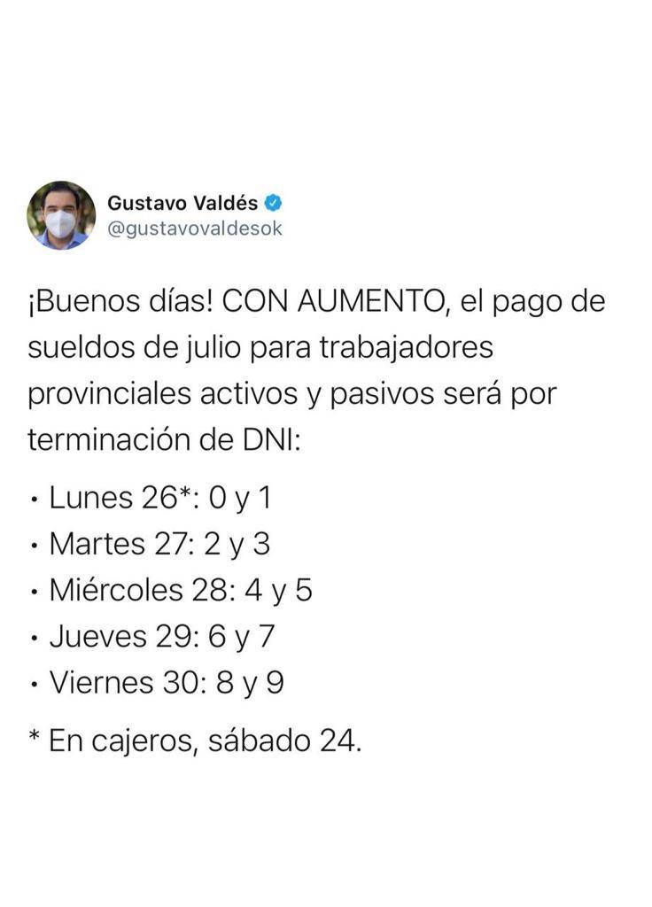 El gobernador Gustavo Valdés comunicó a través de sus redes sociales, el cronograma de pago de sueldos -con aumento- correspondiente al mes de julio, para para trabajadores provinciales activos y pasivos.